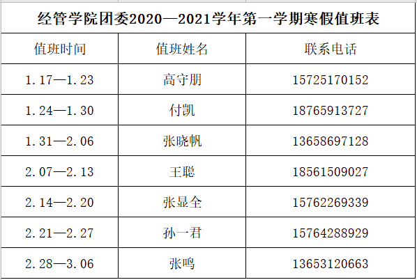 xvideo 团委2020—2021学年第一学期寒假值班表