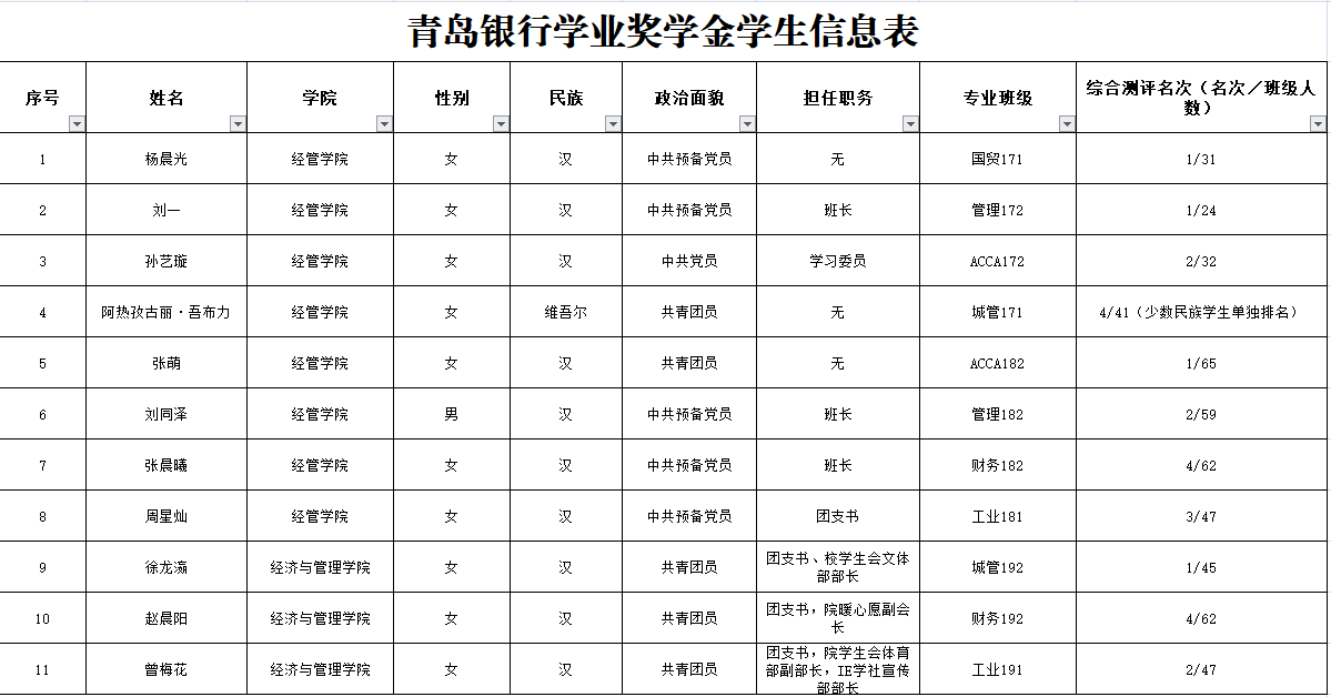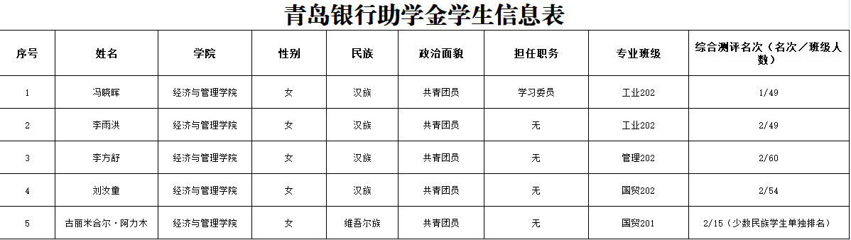 根据学校《2020年度青岛银行奖助学金的通知》的要求,经个人申请、材料审核,结合前期奖助学金获得情况,现对青岛银行奖助学金获得者予以公示,公示期3个工作日,公示时间2021年3月31日-2021年4月2日。