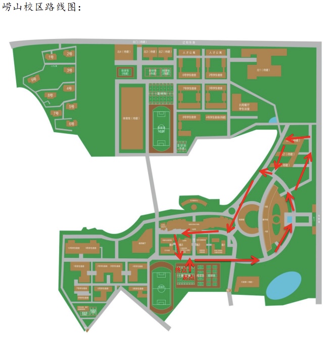 1.参加开学跑的新生着学院“强国有我”文化衫,南苑篮球场集合,从起点出发,按照指定路线奔跑(见图)。