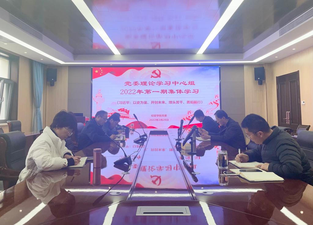 党委理论学习中心组于经管楼313会议室开展2022年度首期集体学习,理论学习中心组全体成员参与学习,党委书记李德成主持学习。