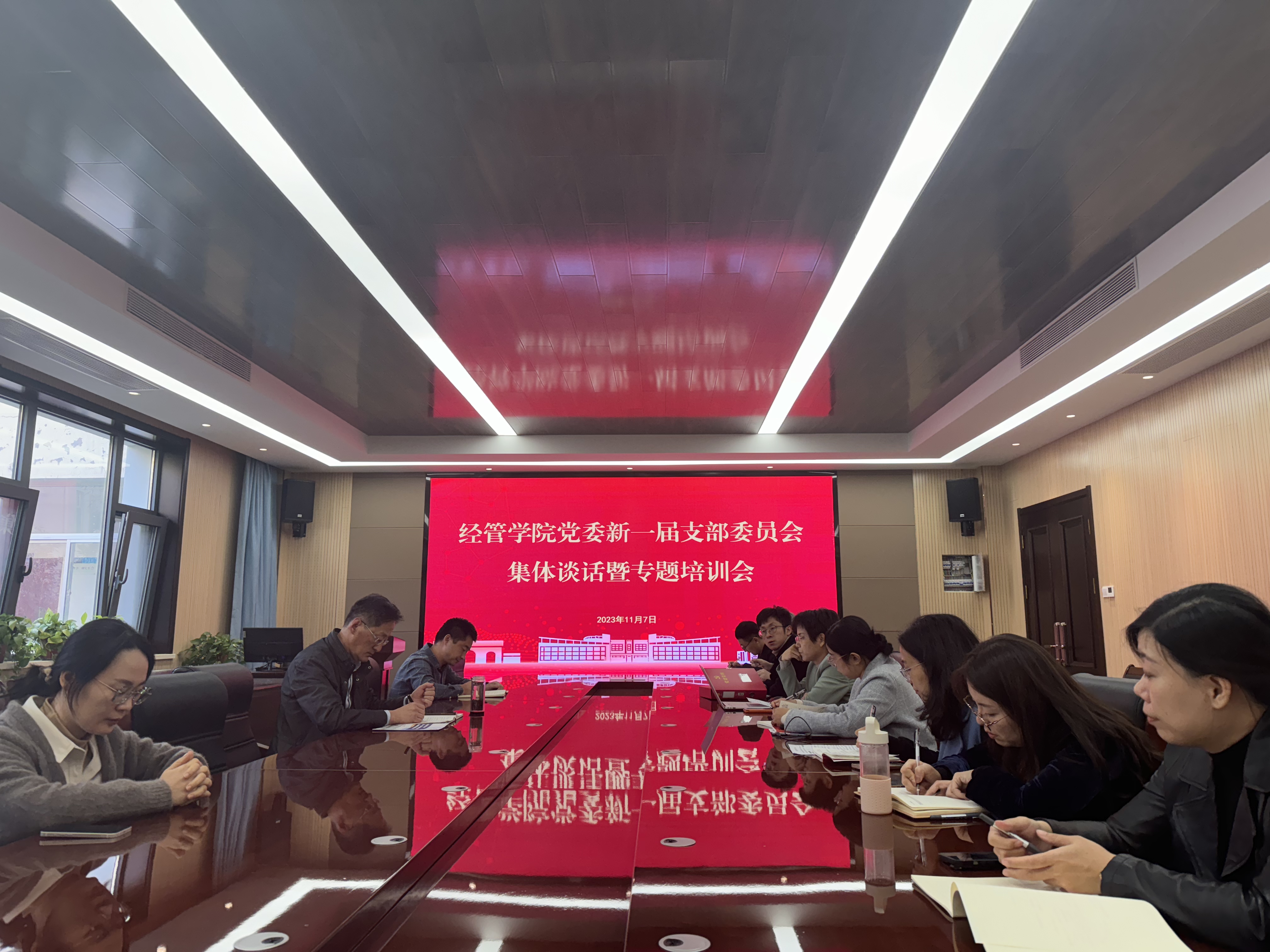 党委在经管楼313会议室召开新一届支部委员集体谈话暨专题培训会。学院党委书记李德成主持会议,各教工支部、学生支部委员会成员参加会议。