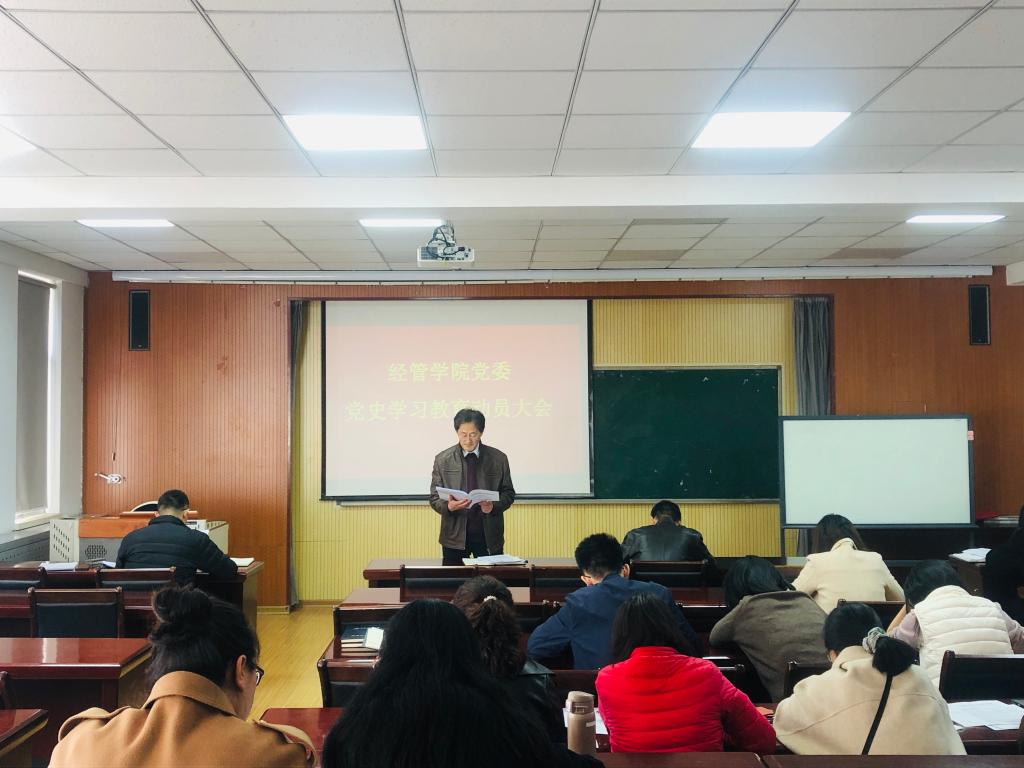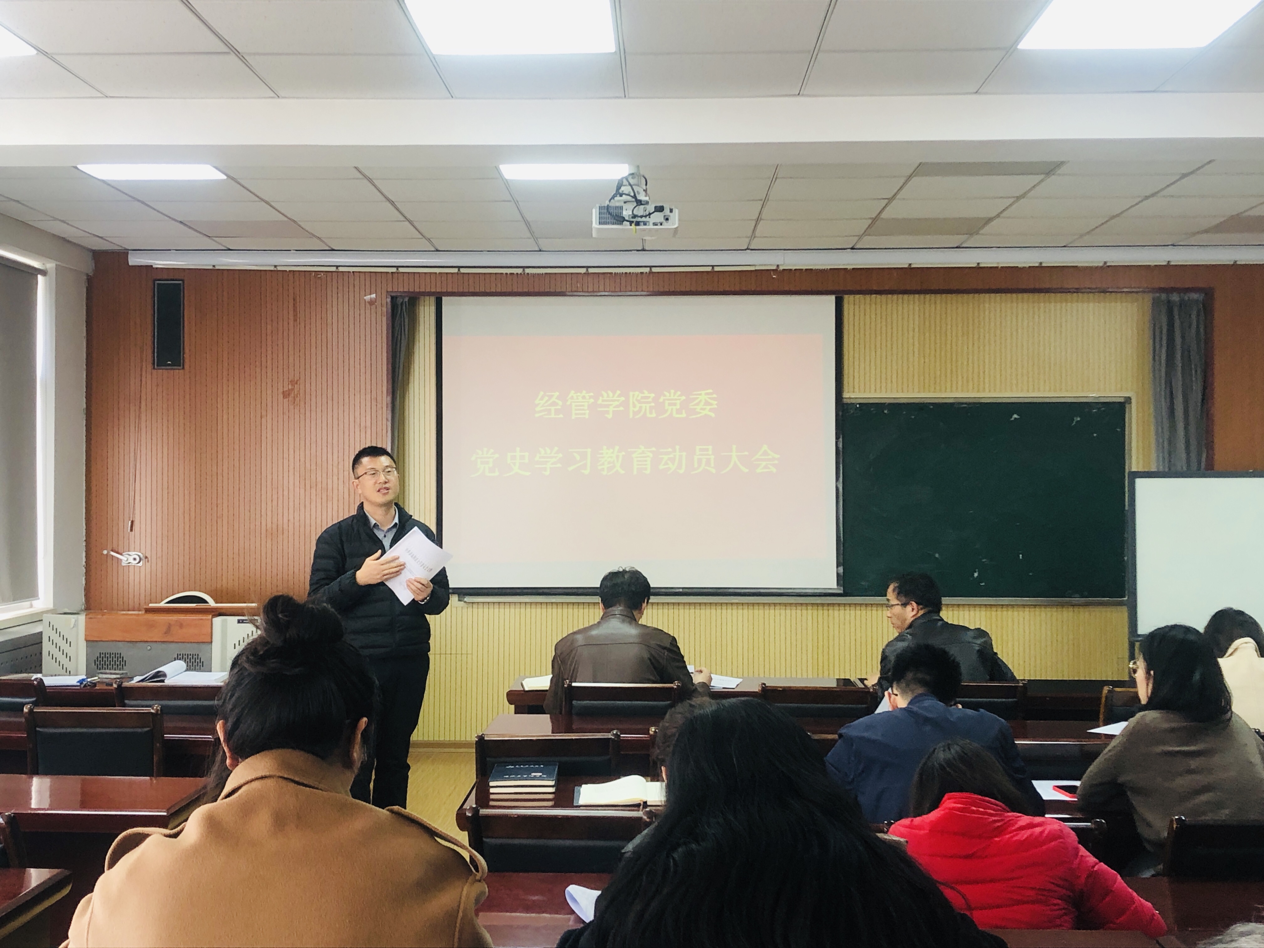党史学习教育动员大会于经管楼419会议室举行,学院党委领导班子、各支部书记、副书记及支部委员参加,学院党委书记李德成主持会议。