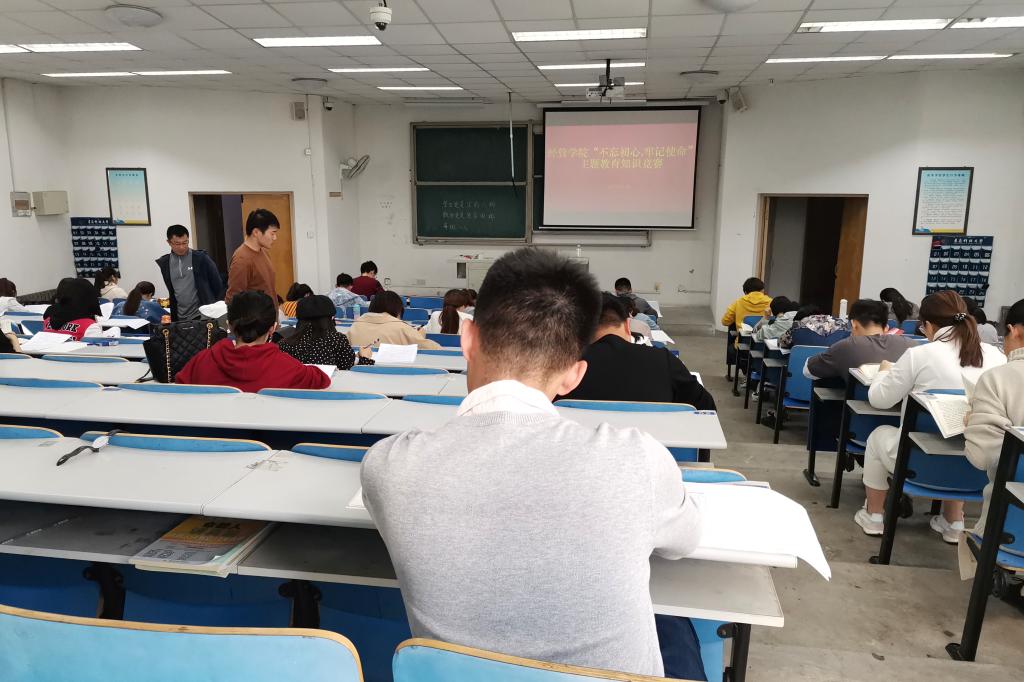 学生党支部于10月20日在弘毅楼E203教室举行了学生党员“不忘初心、牢记使命”主题教育知识竞赛,全体辅导员以及学生党员共57人参加了本次知识竞赛。