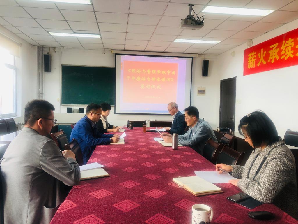 于经管楼415会议室举行《中层干部廉洁自律承诺书》签订仪式,学院党政领导班子参加,学院党委书记李德成主持仪式。