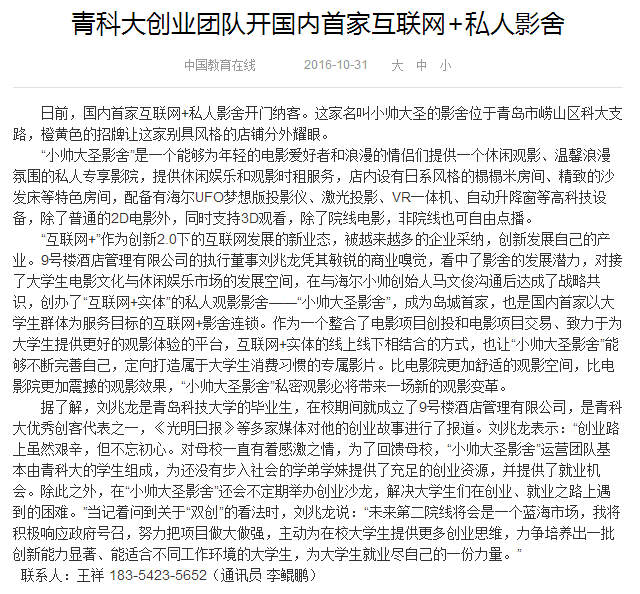 学长刘敏,工商管理双专业毕业生,环境学院15届毕业生,在校期间,利用自己掌握的外教资源,成立青岛特瑞莎教育咨询公司,15年其创业事迹被央视焦点访谈栏目报道。