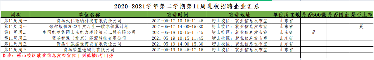 【校园宣讲会】2020-2021学年第二学期第11周进校招聘企业汇总