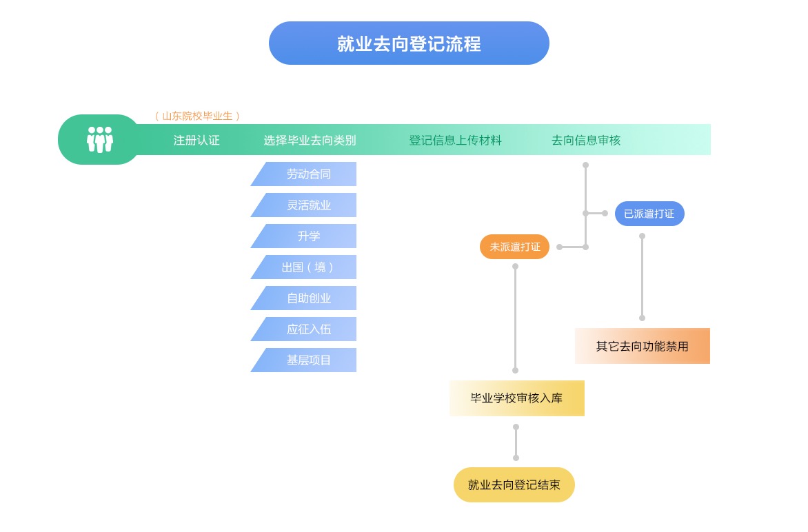 该栏目实现省内院校毕业生签订就业协议之外的毕业去向信息登记功能。包括劳动合同就业、灵活就业、升学、出国、自主创业、应征入伍和基层项目就业七种去向。