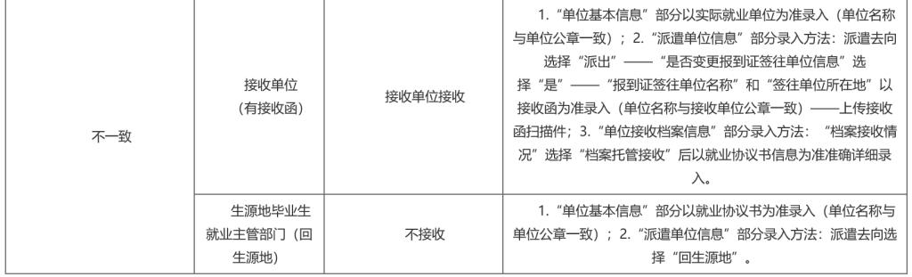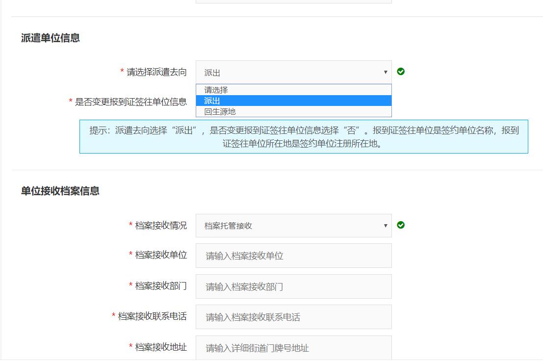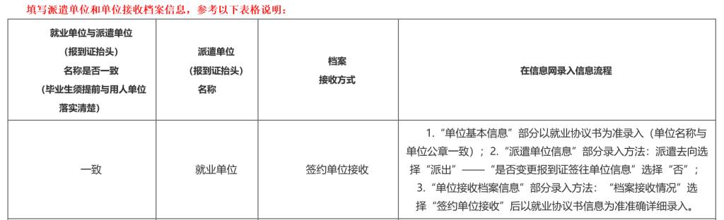 填写派遣单位和单位接收档案信息,参考以下表格说明: