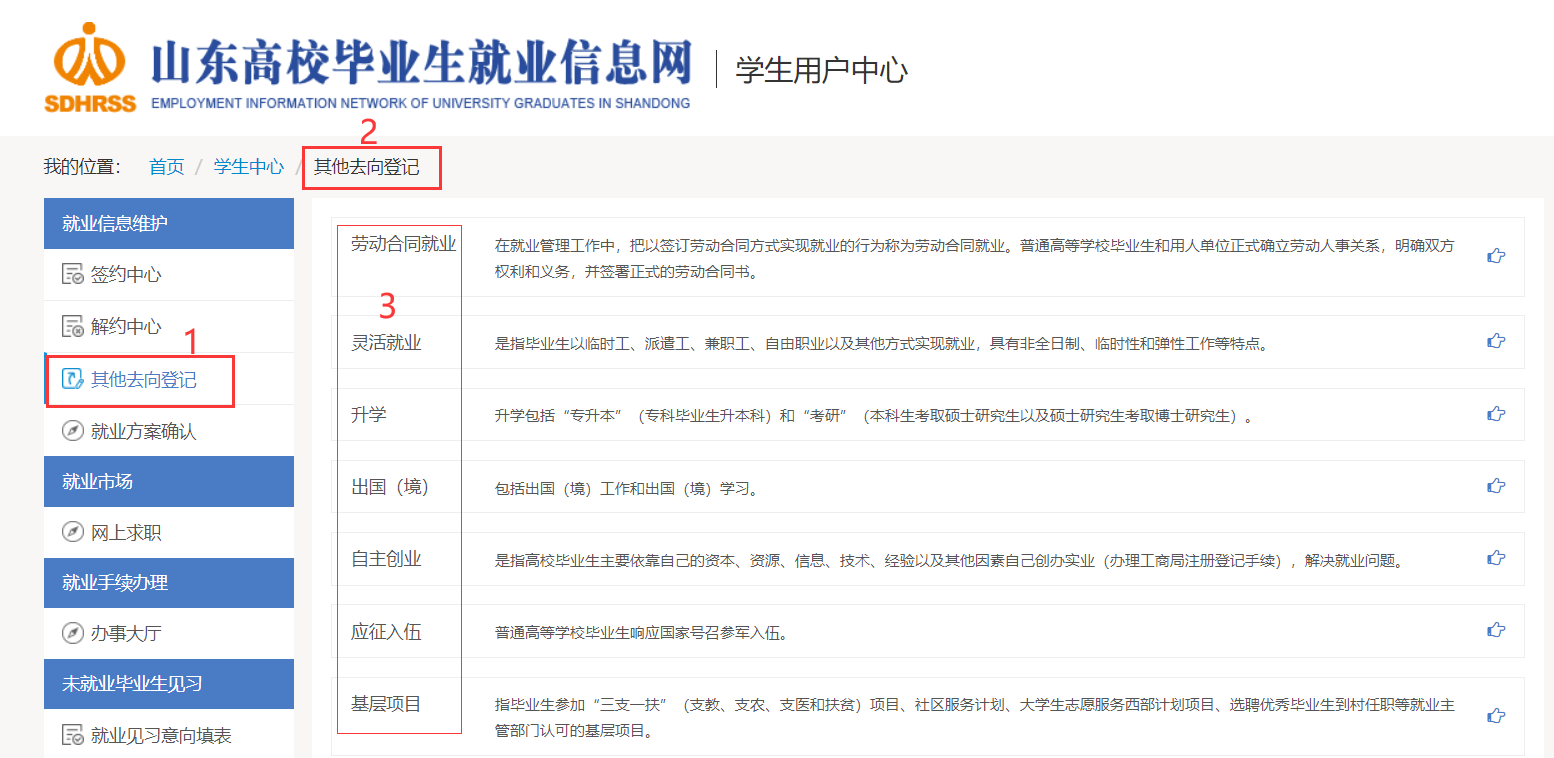 操作说明:如果毕业生与单位签订合同方式就业,在信息网“就业信息维护”栏目点击“其他去向登记”——点击“选择就业去向”——点击“劳动合同就业”