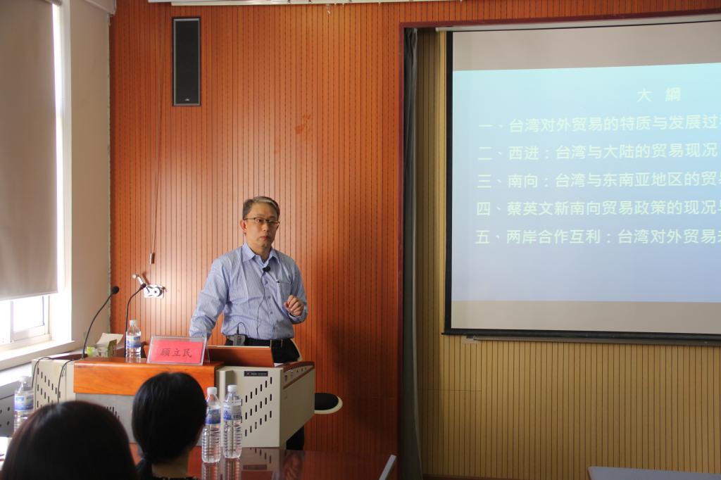 的特邀嘉宾——台北市立大学顾立民教授,杨友才副院长对顾教授作了简要的介绍并代表学院对顾教授到来表示热烈的欢迎!顾教授为大家做了题为《西进与南向—台湾对外贸易政策的走向与未来》的精彩报告。其主要内容包括五部分:台湾对外贸易的特质与发展过程;台湾与大陆的贸易现状;台湾与东南亚地区的贸易现状;蔡英文新南向贸易政策现状与困境;两岸的合作互利。顾教授认为,台湾新南向政策的实施将面临很大的困境,台湾未来的出路是:加强和大陆合作,实现合作共赢。