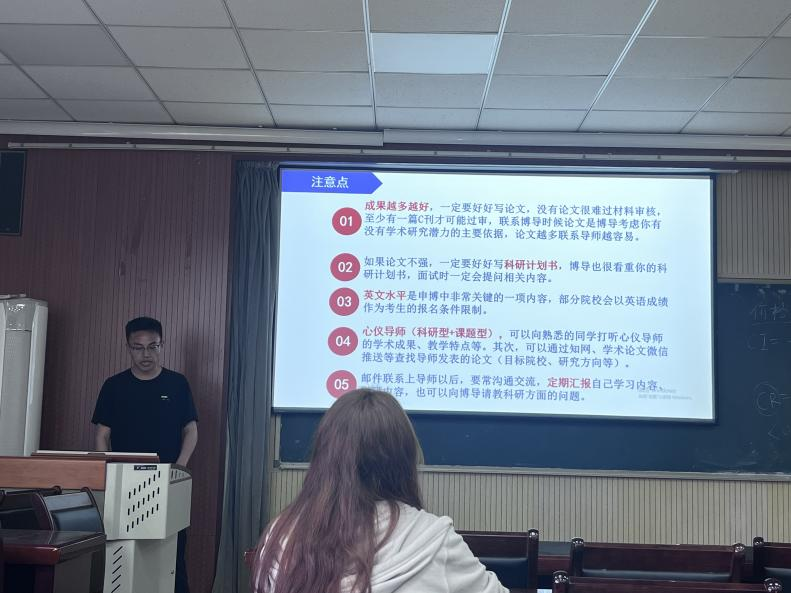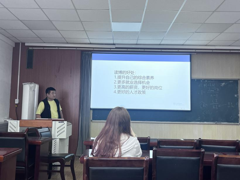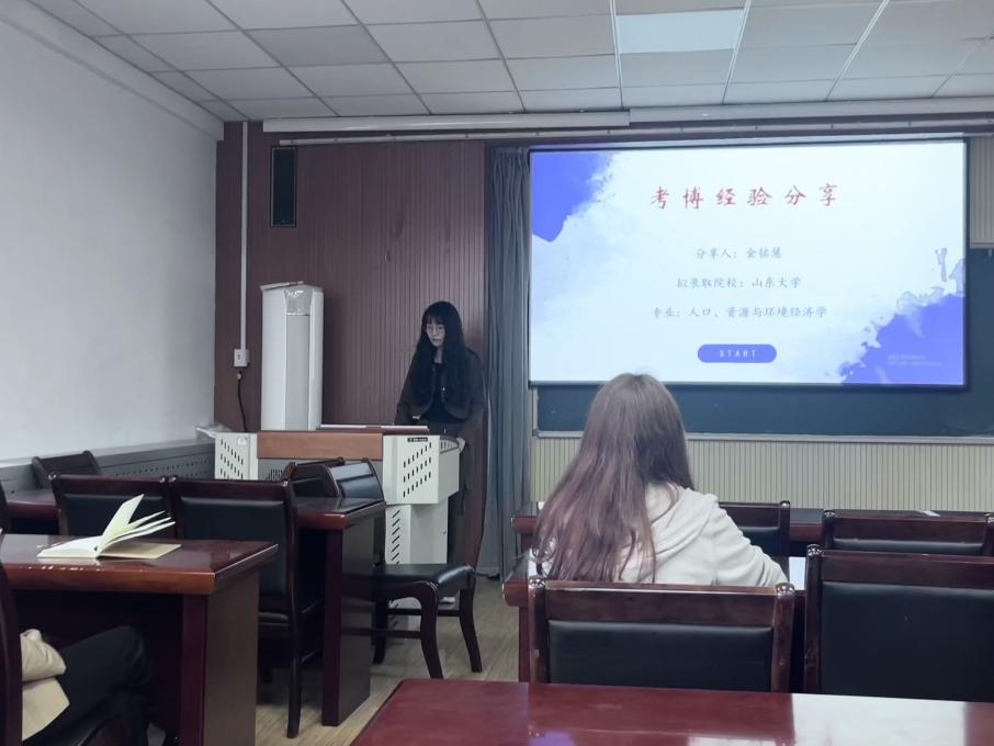 举办了考博经验分享与交流会。本次交流分享会的主讲人分别是何加豪、金铭慧和孙慧桐,这三位同学分别考取中南财经政法大学、山东大学、贵州师范大学。
