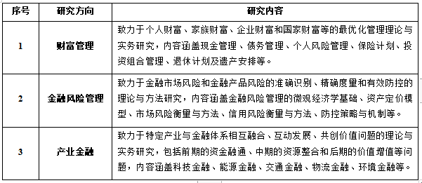 2、以MF教指委的指导性培养方案为依据,立足行业和区域经济发展,强调实践导向,培养创新型金融实践人才,主要设置以下3个研究方向: