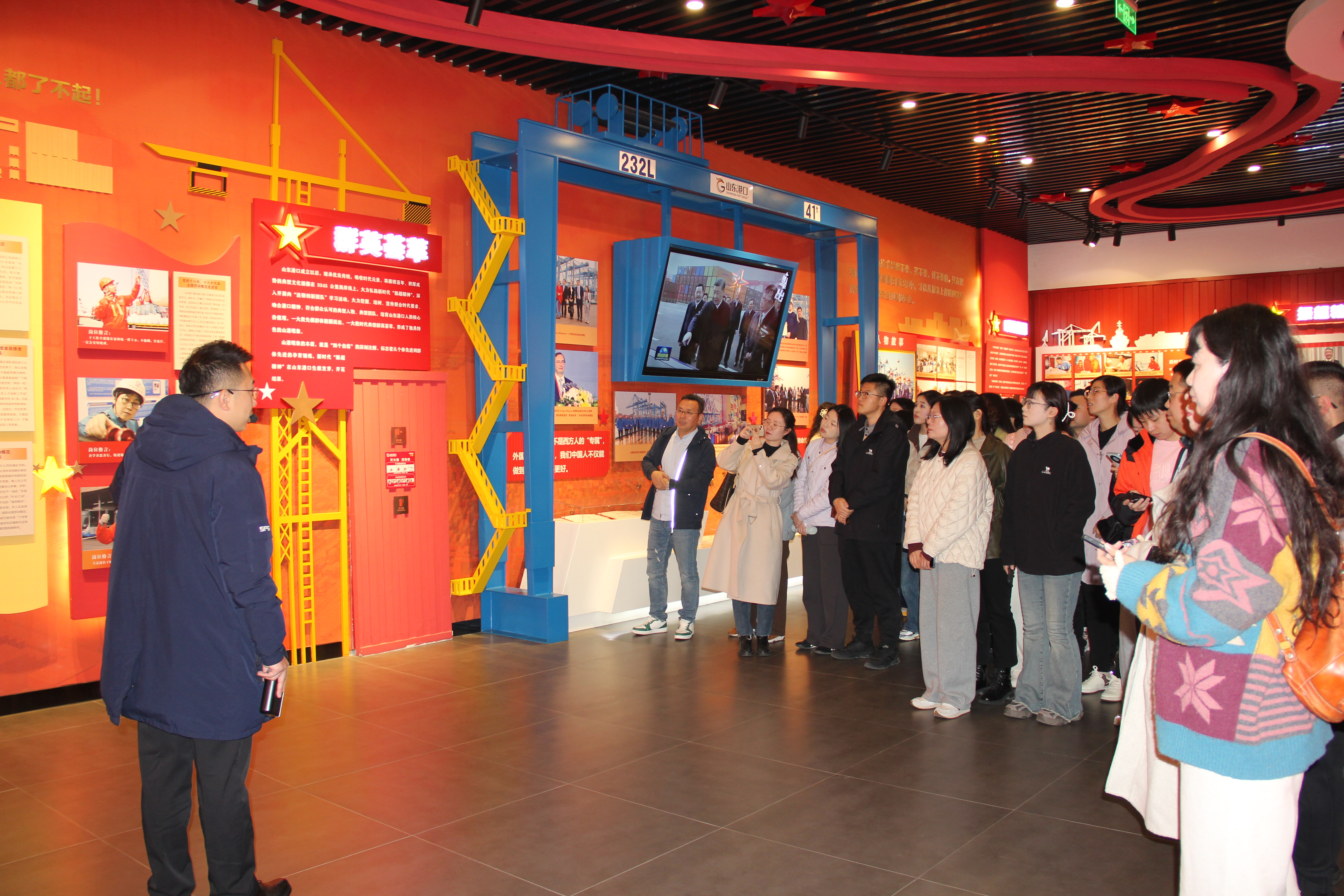 上午,师生一行来到青岛港自动化码头展馆,首先参观了以“平凡铸就伟大,英雄来自人民”为主题的展陈。从“金牌工人”许振超苦练技艺、展现穿针引线般的工匠精神,到“连钢创新团队”历经三年半时间打破国外技术垄断、建成亚洲首个全自动化码头的创新历程,青岛港以党建引领发展,成功实现了从“汗水经济”到“智慧经济”的跨越。
