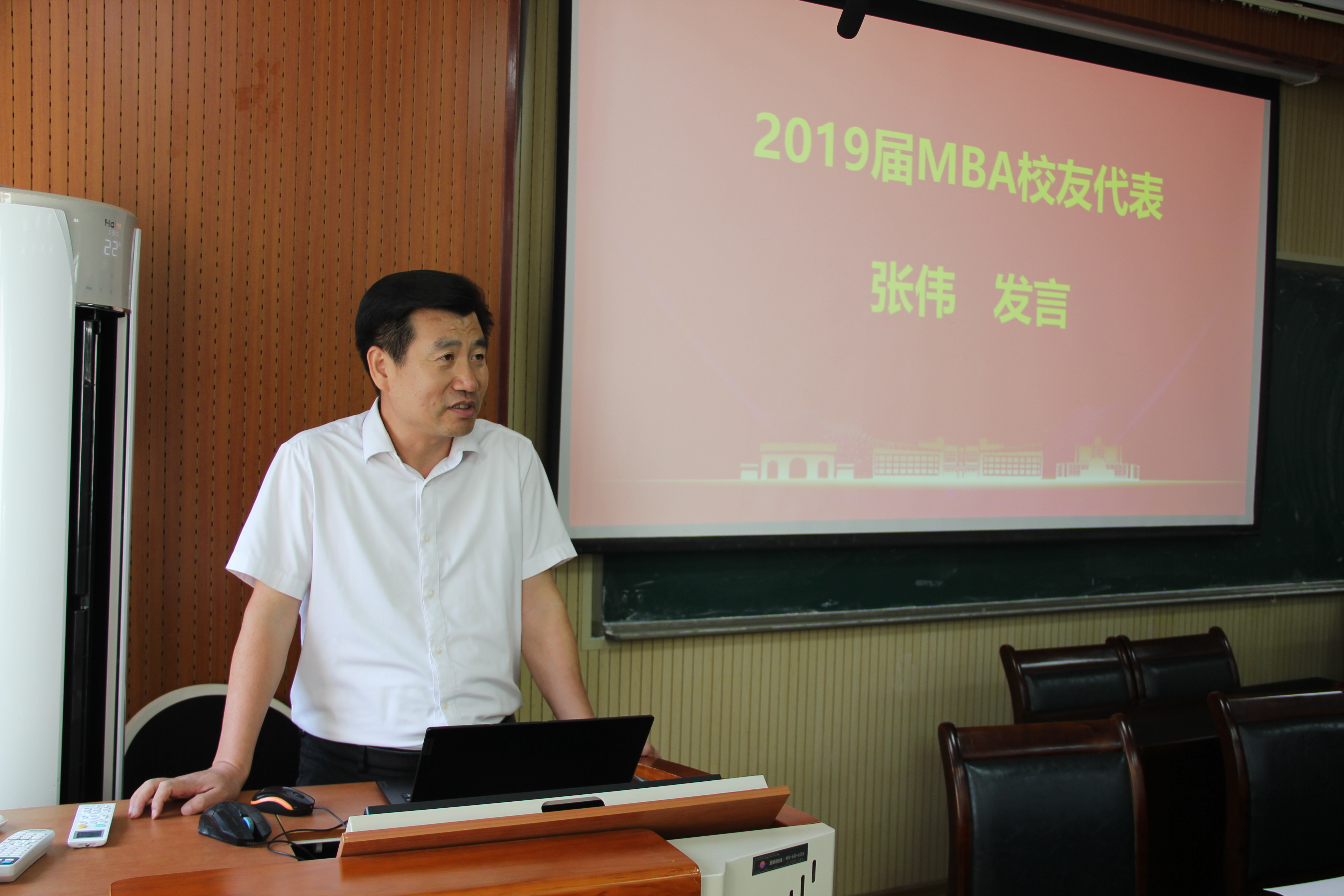2019届MBA校友代表张伟分享了自己从上世纪90年代由中专自学考专科,再考到本科,百战归来再读书,经历“五战”最终考研上岸的励志故事。张伟表示:求学之路异常艰辛,但我始终没有放弃,正是因为我坚持读书、坚持学习,我才收获了丰富的知识、宽广的人脉。在理论知识和工作经验的相互加持下,我才有机会从一名电焊工做到经理,然后组织上又给予了我去西部挂职锻炼的机会,学历是重要的,但是努力更是重要的。
