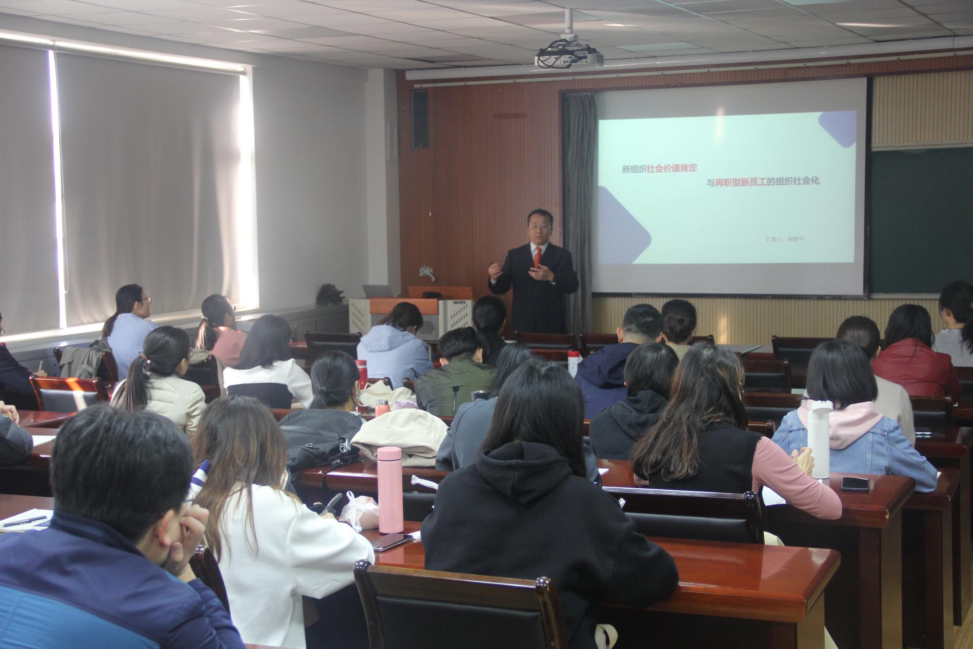 工商管理系主任,博士生导师杨皎平教授为MBA学员做了题为“社会价值肯定与再职型新员工组织社会化”的报告。